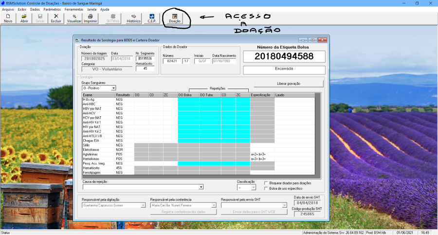 Na figura está destacado o acesso rápido à doação pela tela de SOROLOGIA.